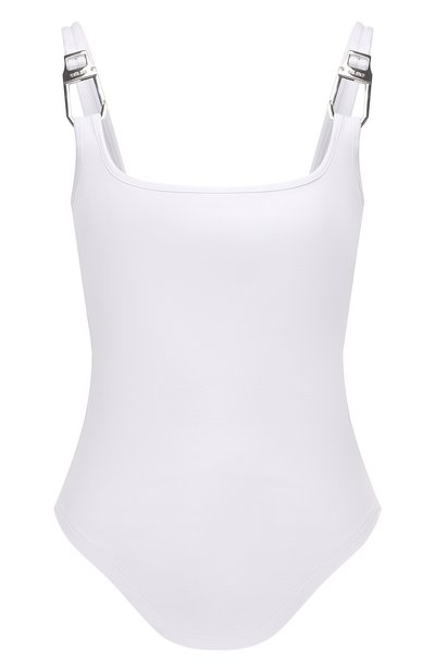 Белый топ из осенне-зимней коллекции получился универсальным, но его не лишили индивидуальности. Фигурным нижним краем модель похожа на боди, а лямки с крупными серебристыми карабинами роднят вещь со спортивными вариантами. За комфорт изделия отвечает мягкое хлопковое джерси, которое хорошо пропускает воздух.