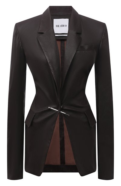 Пиджак оттенка горького шоколада сформирует отчетливый силуэт «песочные часы». Такого эффекта добились акцентированными плечами и драпировками на талии, где модель словно застегивается английской булавкой. На самом деле она играет декоративную роль, а для функционала предусмотрели потайную кнопку. Вещь из мягкой кожи с фактурной поверхностью и полуматовым блеском вошла в коллекцию сезона осень-зима.