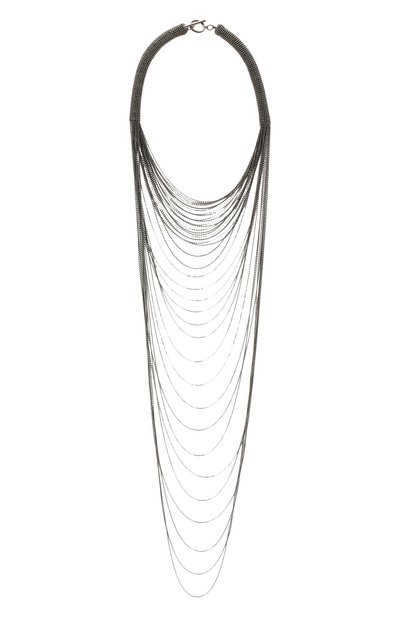 Многоярусное колье, ниспадающее каскадом, собрали из тонких знаковых цепочек мониль, мягко мерцающих в лучах света. Их изготовили из легкого ювелирного сплава с гальваническим покрытием из темной бронзы. Аксессуар дополнили крупным замком-тоглом, который удобно расстегивать и застегивать.