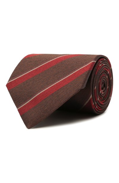 Негласное правило: конец галстука должен быть на два сантиметра ниже пояса брюк, что длина этого аксессуара позволяет сделать, даже если завязан сложный узел. Еще одно неоспоримое достоинство модели — она подстроится под любой костюм и ремень за счет сдержанной цветовой гаммы. Для пошива изделия использовали плотный коричневый шелк с красным полосатым узором.