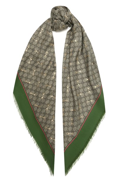 На зеленой шали с бахромой архивный принт GG Supreme представили в новой версии. Его скомбинировали с рисунком в виде узнаваемой пряжки Horsebit, которая впервые появилась на изделиях марки в 1950-х. Золотистые детали особенно эффектно играют при драпировках аксессуара. Мастера марки использовали для его создания плотный шелковистый материал с легким блеском.