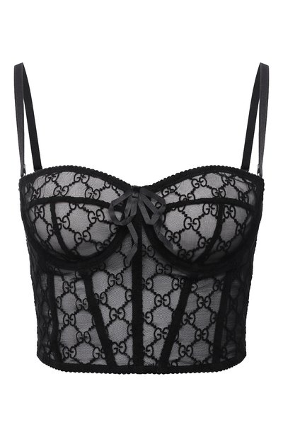 Черный бра-корсет с мягкими чашечками почти не ощущается на теле. Для пошива модели использовали тонкий шелковистый тюль, который не сковывает движения. Для оптимальной поддержки груди у белья с вышитым паттерном GG Supreme предусмотрели косточки и регулируемые бретели.