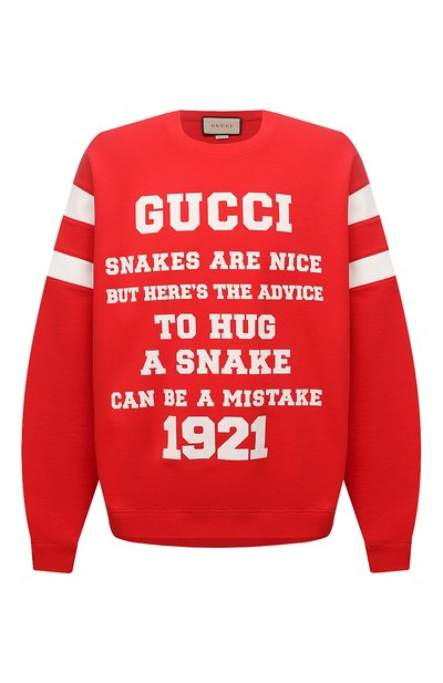Насыщенный красный цвет этого свитшота стал идеальным фоном для крупного белого принта «To hug a snake». Мотив, вдохновленный детскими британскими стихотворениями, Алессандро Микеле дополнил надписями «Loved», «Sin amore nihil» и датой основания бренда. Модель из мягкого хлопкового футера вошла в межсезонную коллекцию марки, основанной Гуччио Гуччи.