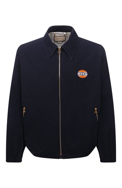 На создание синего бомбера из осенне-зимней коллекции Алессандро Микеле вдохновила спортивная одежда из архивов марки. Эту модель выполнили из особенно прочного хлопкового рипстопа. Спереди изделие декорировали овальным патчем с GG-монограммой, составленной из инициалов Гуччио Гуччи.