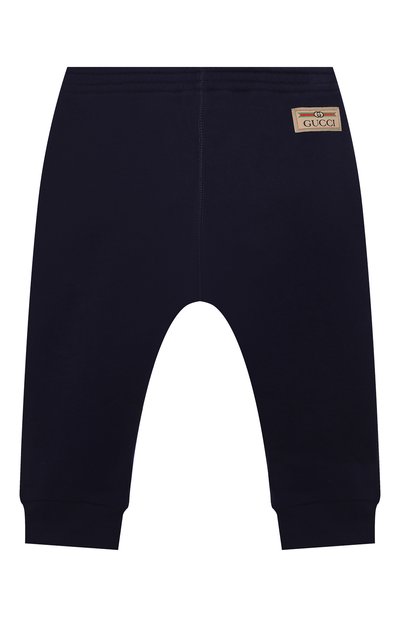 Синие джоггеры с заниженной линией шага сшили из мягкого хлопкового трикотажа. Такой материал не раздражает нежную кожу ребенка, хорошо пропускает воздух и слегка тянется, поэтому модель не сковывает движения. Небольшая нашивка в бежево-красно-зеленых цветах заявляет о принадлежности марке.