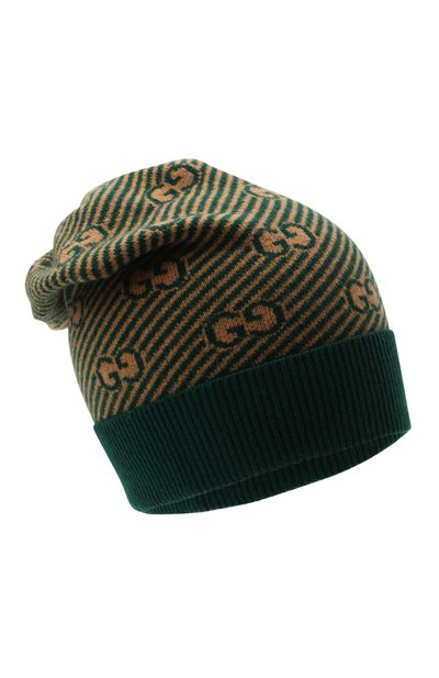 Мастера марки связали шапку из двух оттенков мягкой нежной шерстяной пряжи. Изумрудно-зеленые и песочные нити переплели так, чтобы создать полосатый орнамент и GG-паттерн. Широкий отворот связали резинкой, поэтому аксессуар плотно облегает голову, сохраняя тепло внутри.