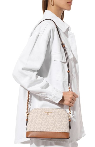 Для пошива небольшой коричневой сумки Jet Set Charm со съемным плечевым ремнем использовали фактурный плотный канвас с повторяющейся монограммой Майкла Корса. О тделку выполнили из гладкого однотонного материала. Спереди модель украсили золотистыми логотипом и эмблемой марки. В аксессуар с двумя карманами поместятся кошелек, паспорт и смартфон.