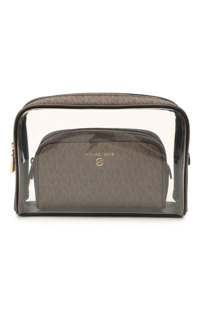 В прозрачную косметичку из гибкого полимера поместится все необходимое: тушь, помада, небольшой набор теней. Кисти можно хранить отдельно благодаря уменьшенной версии аксессуара, которую выполнили из фирменной бежевой канвы с MK-узором. Такое изделие будет легко очистить от случайных пятен.