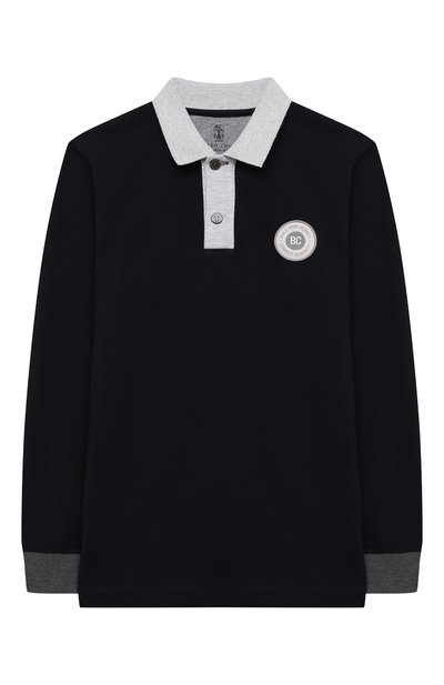 Для изготовления темно-синего поло с длинными рукавами использовали легкое хлопковое пике. Его отборные волокна прочные и гладкие, поэтому трикотаж на ощупь напоминает шелк, немного тянется и не теряет форму со временем. Модель с серыми отложным воротником и манжетами декорировали круглым патчем с мотивирующим слоганом.