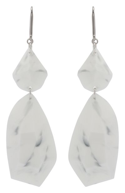 Серьги с крупными фигурными подвесками из смолы не терпят конкуренции, поэтому наши стилисты предлагают собрать волосы в хвост и отказаться от массивных колье. Мастера марки использовали для изготовления модели легкую латунь с гальваническим серебряным напылением.