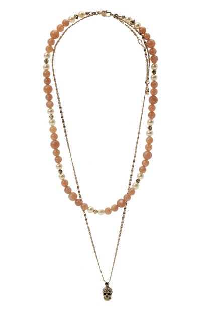 Двойное колье сразу попадает в центр внимания. Короткая нить, собранная из полированных круглых бусин розового и кремового оттенков не выглядит излишне нежно за счет деталей в виде фирменных черепов. С ними перекликается подвеска на тонкой цепочке из легкого ювелирного сплава.