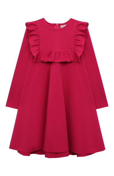 Расклешенное ярко-розовое платье с длинными рукавами мастера марки сшили из мягкого эластичного джерси на основе шелковистой немнущейся вискозы и легкого прочного полиэстера. Вещь из такого материала не сковывает движения, не раздражает и не перегревает кожу, поэтому в ней будет комфортно весь день. Модель с потайной молнией сзади декорировали широкими оборками и миниатюрным вышитым логотипом.