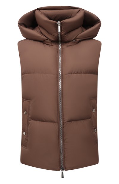 Темно-бежевый жилет из осенне-зимней коллекции успешно справляется с ролью верхней одежды в прохладную погоду. В этом ему помогают материалы. Маст ера марки сшили модель из прочного полиэстера, который хорошо защищает от ветра. Слой отборного гусиного пуха поддерживает комфортную температуру. Съемный капюшон может стать альтернативой головному убору.