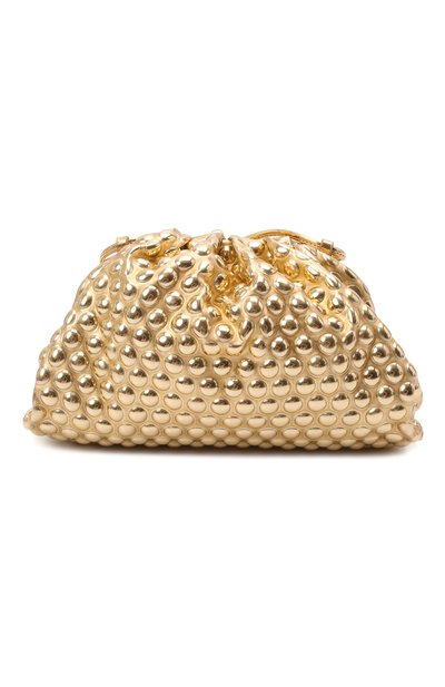 Клатч Pouch из осенне-зимней коллекции может стать главным акцентом в образе. Дело не только в металлизированном золотистом оттенке, но и в декоре. Аксессуар из нежной тонкой наппы украсили рисунком, напоминающим игрушки-антистресс. Модель с небольшой драпировкой, скрывающей рамочный замок, дополнили узким ремнем, поэтому изделие удобно носить и в руке, и на плече.