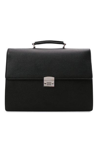 Портфель с короткой ручкой может стать идеальным завершением образа в стиле smart casual, а сдержанный черный цвет и отсутствие декора подружат его со строгим деловым костюмом. Для пошива однотонного аксессуара из коллекции сезона осень-зима использовали мягкую зернистую кожу, которая считается особенно прочной. Внутрь поместятся бумаги формата А4, планшет, смартфон.