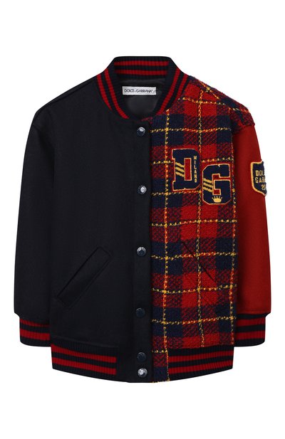 Будто сшитый из двух вещей разноцветный бомбер с врезными карманами украшен крупными нашивками с символикой марки. Одна часть — однотонная темно-синяя, другая — красная в крупную клетку. Утепленная куртка из мягкой шерсти застегивается на кнопки.