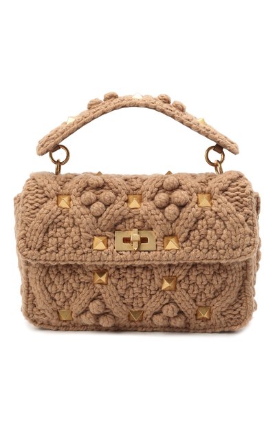 В случае с бежевой сумкой Roman Stud из межсезонной коллекции Пьерпаоло Пиччоли сделал ставку на тактильные ощущения. Мастера марки, основанной Валентино Гаравани, связали модель из нежной кашемировой пряжи, поэтому она получилась особенно приятной на ощупь. Мягкости материала противопоставлены крупные шипы-пирамиды, которые подчеркивают трехмерный ромбовый узор. В комплекте – съемные ручка и плечевой ремень.