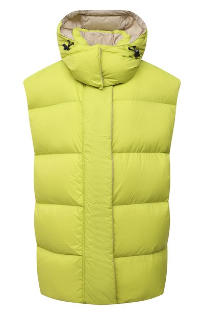 В осенне-зимнюю коллекцию Массимо Джорджетти включил светло-зеленый стеганый жилет из легкого, но прочного непромокаемого нейлона. Но материал не единственное достоинство модели с глубоким съемным капюшоном. Ее можно вывернуть наизнанку, чтобы продемонстрировать нежный кремовый оттенок и монохромный принт в виде цитаты поэтессы Эмили Дикинсон сзади. За тепло отвечает невесомый гусиный пух, равномерно распределенный по камерам.
