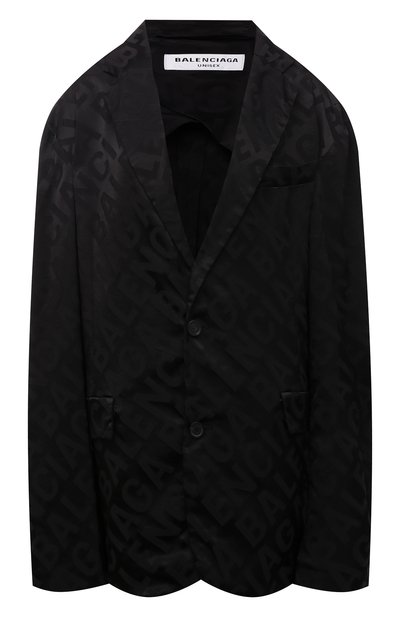 В интерпретации Демны Гвасалии черный пиджак из коллекции сезона осень-зима не выглядит строго. Мягко облегать плечи и ниспадать, словно накидка, модели силуэта оверсайз помогает немнущаяся шелковистая ткань на основе вискозы. Жаккардовый паттерн с логотипами заявляет о принадлежности бренду, основанному Кристобалем Баленсиагой.