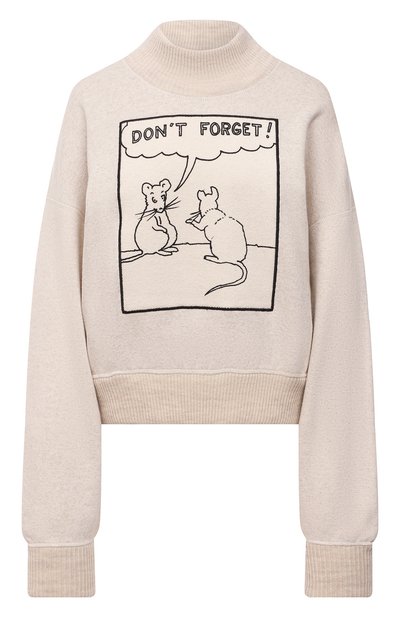 Работая над осенне-зимней коллекцией марки, основанной Энрике Лоэве, дизайнер Джонатан Андерсон черпал вдохновение в творчестве американского художника Джо Брейнарда. Например, этот кремовый пуловер с воротником-стойкой декорировали спереди и сзади крупными фактурными патчами с графичным изображением мышей. Укороченную модель связали из легкой шелковистой вискозы с добавлением волокон мягкого хлопка и прочного льна.