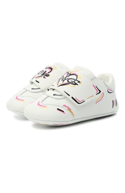 Мастера марки сшили белые кеды из эластичной мягкой кожи, украшенной разноцветным мотивом, словно нанесенным вручную. Высокий плотный задник обеспечивает правильное положение стопы, а посадку удобно регулировать широким ремешком с застежкой велькро.