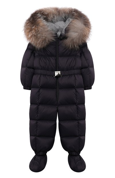 В темно-синем стеганом комбинезоне ребенку не будет холодно даже в суровые морозы. Для изготовления модели мастера марки использовали фирменный непродуваемый нейлон с микропереплетением, которое делает его непроницаемым для легкого пухового наполнителя. Такая ткань не промокнет от сильного снега. Для большего удобства изделие дополнили пинетками, а объемный капюшон украсили пышным мехом песца, прикрывающим глаза.