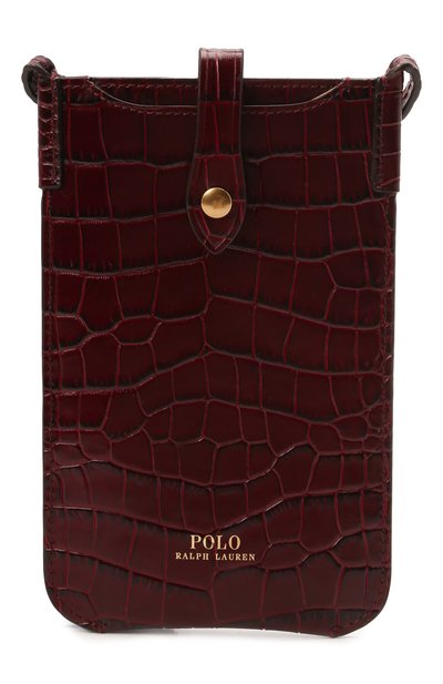 Прямоугольный бордовый чехол для телефона сшит из глянцевой прочной кожи с тиснением под крокодила. Помимо основного отделения внутри предусмотрен отсек для денег или картхолдера. Аксессуар с узким плечевым ремнем украшен логотипом марки.