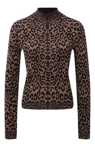 Облегающий коричневый кардиган с потайной молнией и длинными рукавами — хорошая альтернатива блузе в лаконичном наряде. Мягкая легкая модель из осенне-зимней коллекции марки, основанной Валентино Гаравани, сшита из тонкого шерстяного трикотажа с леопардовым принтом.