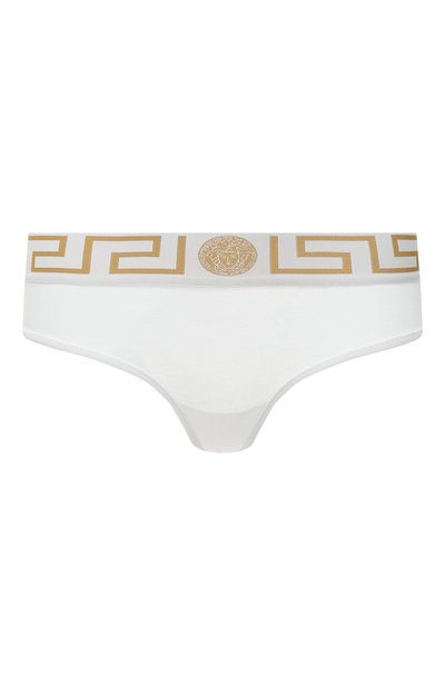 Главные требования, предъявляемые к белью, – это удобный крой, не сковывающий движения, и легкий материал, обеспечивающий коже комфорт. Белые трусы из мягкого дышащего хлопка полностью соответствуют этим правилам. Широкий эластичный пояс, который не впивается в тело, украсили знаковым меандровым орнаментом.
