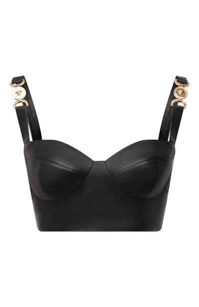 Черный кроп-топ из осенне-зимней коллекции может стать стилеобразующим объектом в образе. Внимание приковывает и скульптурный силуэт, навевающий ассоциации с корсетами, и сам материал. Мастера марки, основанной Джанни Версаче, сшили модель из тонкой матовой кожи. Лямки украсили пряжками с барельефом головы горгоны Медузы и меандровым узором.