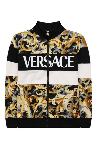 Толстовку с воротником-стойкой сшили из мягкого хлопка. За счет плотного переплетения волокон этот материал меньше продувается ветром и защищает от небольшого дождя, поэтому модель сможет заменить легкую куртку в прохладный день. Яркий золотистый мотив Baroccoflage Kids, наравне с крупным логотипом спереди, громко заявляет о принадлежности вещи марке.