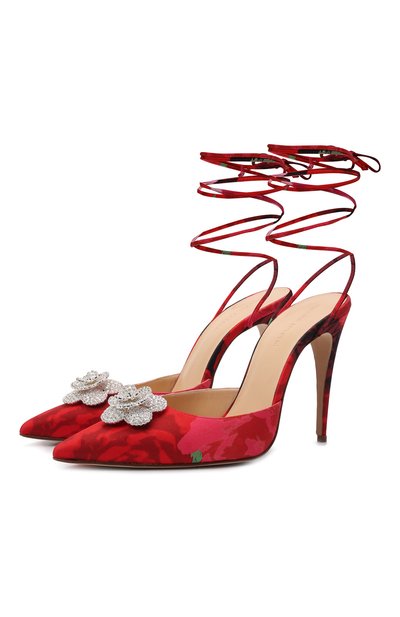 Туфли из осенне-зимней коллекции станут ключевым акцентом в образе. Модель справится с этой задачей благодаря яркому абстрактному принту, палитру оттенков которого Магдалена Бутрим позаимствовала у роз, и объемной съемной броши в виде цветка, собранного из сверкающих кристаллов. Для изготовления обуви с узкими лентами, обвивающими щиколотки, дизайнер выбрала прочный шелковистый текстиль.