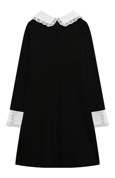 Черное платье станет удачным вложением в школьный гардероб. Для пошива изделия А-силуэта мастера бренда использовали мягкий вискозный трикотаж с добавлением эластичных волокон, отвечающих за сохранение первоначальной формы вещи. Модель дополнили атласными лентами спереди и белым отложным воротником, который, как и широкие манжеты на длинных рукавах, подчеркнули узким кружевным кантом.