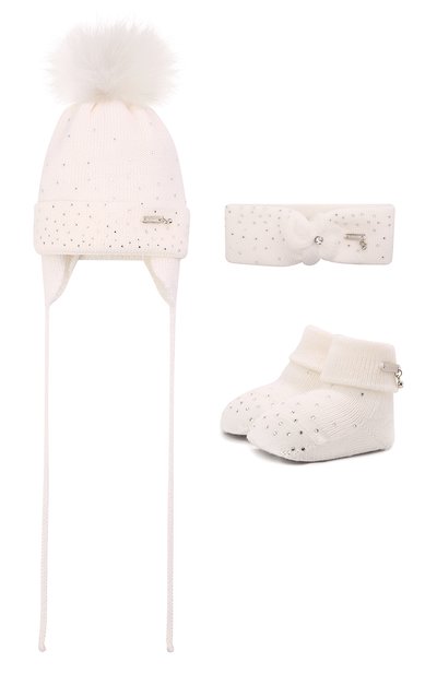 В комплект вошли шапка бини с небольшими наушниками и помпоном из меха песца, широкая эластичная повязка и пинетки с объемными манжетами. Изделия из нежной шерсти мериноса с волокнами в три раза тоньше человеческого волоса хорошо согревают, но при этом очень легкие. Декор в виде переливающихся кристаллов поддержали брендированными пластинами со знаковыми шармами.