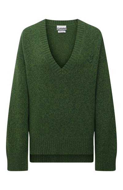 У зеленого свитера из осенне-зимней коллекции много плюсов, но главное достоинство — материал. Модель свободного кроя выполнили из меланжевой шерстяной пряжи. Она на 50% состоит из переработанных волокон. За счет такой технологии получилось сократить объем вредных выбросов и расход воды.