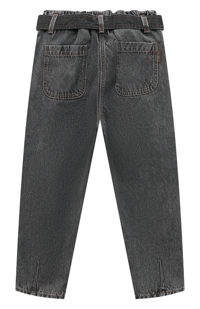 Серые джинсовые джоггеры с высокой посадкой и стрелками выполнены из плотного гладкого хлопка с потертостями. Брюки комфортного кроя не сковывают движения и хорошо пропускают воздух. Задний карман украшен нашивкой из знаковых для марки цепочек мониль.