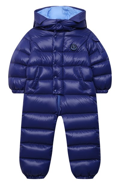 Синий стеганый комбинезон с глубоким капюшоном и эластичными манжетами мастера марки сшили из прочного глянцевого нейлона. Материал не пропускает влагу и ветер внутрь и легко очищается от загрязнений. За сохранение тепла отвечает почти невесомый пуховый наполнитель. Модель застегивается молнией, скрытой под широкой планкой с кнопками.