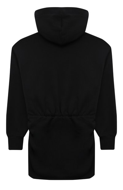 В черном платье с дизайном, как у худи, ребенку будет удобно и на прогулке, и во время активных игр. Крой со спущенной линией плеч обеспечивает необходимую свободу движения, а плотный хлопковый футер отвечает за терморегуляцию. Модель украсили белым принтом в виде медведя, который будто нанесли, распылив краску на трафарет.