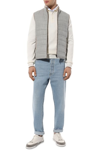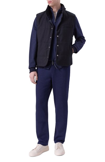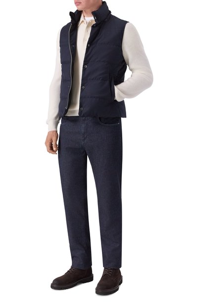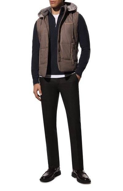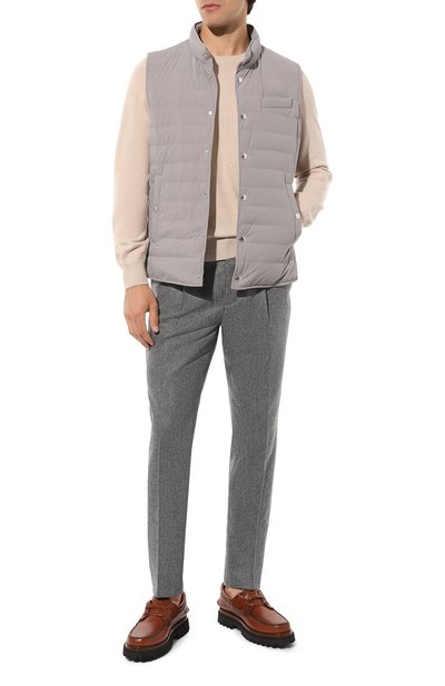 Утепленный стеганый жилет с высоким воротником и съемным регулируемым капюшоном выполнили из меланжевой шерсти. Модель дополнили тремя карманами с отделкой из замши в тон.