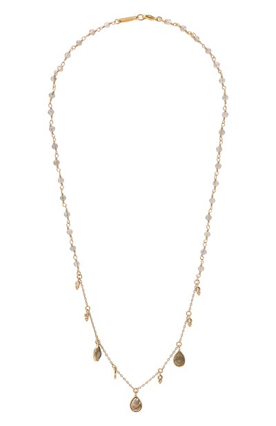 У тонкого колье-цепочки сдержанный дизайн. За настроение аксессуара отвечают небольшие каплевидные подвески со вставками из лабрадорита, которые поддерживают миниатюрные детали из кубического циркония, заменившие некоторые звенья. Для изготовления модели использовали легкий ювелирный сплав с гальваническим покрытием золотом.