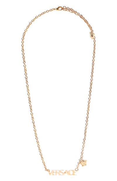 Колье громко заявляет о своей принадлежности бренду как при помощи вставки в форме логотипа, так и благодаря небольшой подвеске с изображением головы горгоны Медузы. Мастера марки выполнили аксессуар в виде тонкой цепочки из легкого ювелирного сплава с гальваническим золотым покрытием.