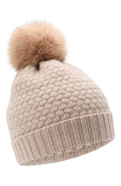 Представленную эксклюзивно в ЦУМе светло-бежевую шапку с арановым узором и пушистым помпоном связали из плотной кашемировой пряжи. Ее волокна с воздушными микрополостями в структуре накапливают тепло, но не перегревают, не вызывают аллергию и не раздражают кожу в отличие от шерстяных. Для дополнительной защиты от ветра предусмотрели широкий отворот.