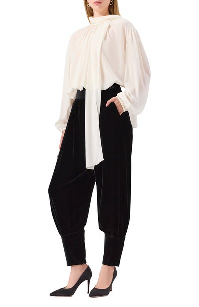 В сезоне осень-зима Джорджио Армани экспериментировал с кроем лаконичных черных брюк. Модель из нежного шелкового атласа дизайнер дополнил широкой асимметричной деталью так, чтобы казалось, что поверх надели юбку с боковым разрезом. Такая вещь может стать основой торжественного образа total black. Остается надеть топ с фигурным вырезом, босоножки на шпильке и взять в руки сумку.