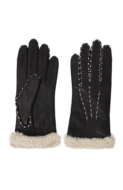 Темно-зеленые перчатки мастера марки сшили из мягкой зернистой кожи и дополнили внутренней отделкой из приятной на ощупь шерсти. Объемные швы подчеркнули белыми контрастными стежками. Их цвет поддерживает пушистая опушка на манжете.