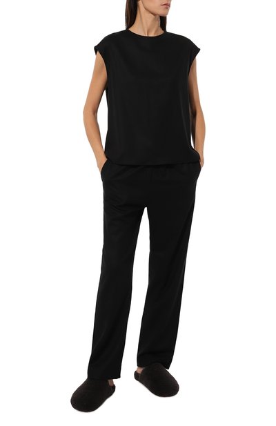 Для изготовления домашних туфель универсального черного цвета мастера марки использовали мягкую зерненую кожу. Верх из нее частично задрапировали широкими брендированными лентам и, ставшими визитной карточкой для вещей из линии Woody. Тапочки с закрытым мысом дополнили гибким протектором с рифлением, усиливающим сцепление с гладким полом.