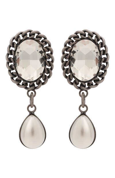 Клипсы с крупными, стилизованными под жемчуг подвесками, — беспроигрышное решение для коктейльного наряда. Овальное основание с многогранным прозрачным кристаллом декорировали цепочкой по краю, изготовленной из ювелирного сплава с гальваническим покрытием серебром.