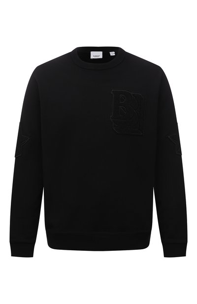 В осенне-зимнюю коллекцию вошел черный свитшот из мягкого хлопкового футера. Благодаря характерной текстурной изнанке трикотаж хорошо сохраняет тепло, поэтому в модели будет комфортно в прохладную погоду. Изделию с круглой горловиной добавили фактурных деталей: аппликации в виде заглавной буквы логотипа бренда спереди и звезд на рукавах выполнили из буклированного материала.