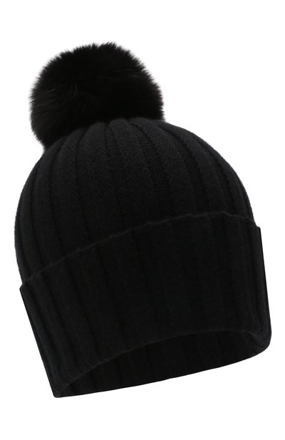 Мастера марки связали черную шапку бини рельефным узором из мягкой шерстяной пряжи. Чтобы модель с широким отворотом и помпоном из меха песца получилась мягче и легче, в состав добавили тонкие кашемировые волокна. Аксессуар комфортно облегает голову и обеспечивает защиту от ветра.