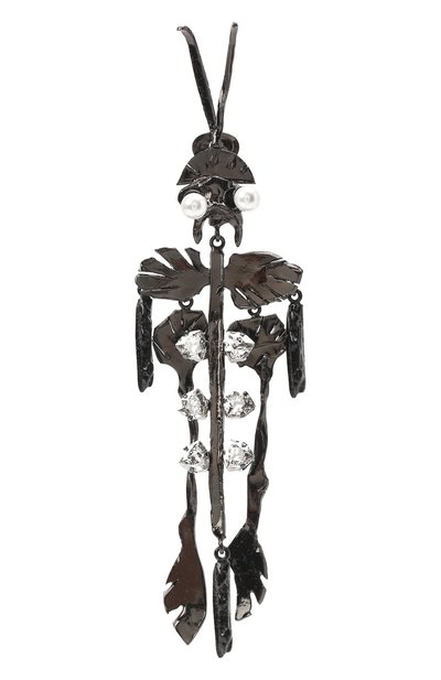 Эта клипса — одно из тех украшений, сразу приковывающее взгляды окружающих. На wow-эффект работает сложная форма и черная глянцевая эмаль, которой покрыли аксессуар из легкого ювелирного сплава. Модель инкрустировали прозрачными вставками из стекла и крупными кристаллами Swarovski, стилизованными под жемчуг.