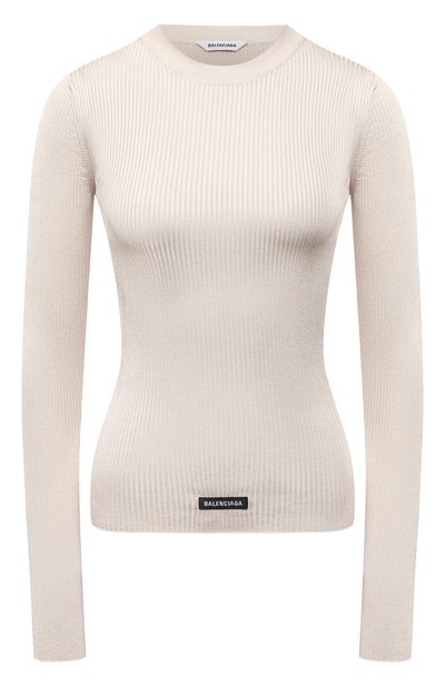 Бежевый пуловер заявляет о своей принадлежности бренду максимально деликатно. Модель украсили лишь небольшим патчем с логотипом марки, основанной Кристобалем Баленсиагой. Для производства изделия использовали тонкий шелковистый трикотаж, который за счет добавления эластичных нитей плотно облегает фигуру.
